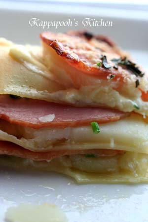 チーズソースが足りなくって残り一枚のラザニアがあったので、それはジャガイモをレンジで加熱して、マヨネーズ、パルメザンチーズ、ベーコンで層にしてまたまたオーブントースターで焼き色をつけます。