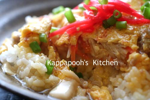 ご飯の上に乗っけて、前日のくずあんにみりん・砂糖・醤油・酢を加えて、上からかけます。