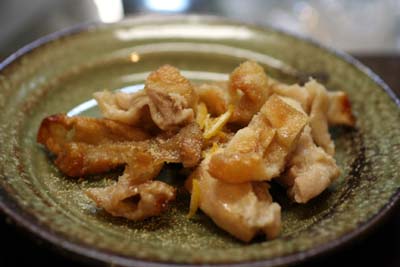 そして、いつも鶏で鍋をすると皮の部分がグニッとなっているのを嫌う夫に皮を剥いでいつものように鶏皮だけをオーブントースターで焼いてあげました。柚子を添えて、柚子ソルトで。