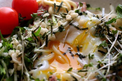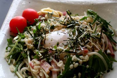 茹で上がった麺を水にさらして洗い、水気を切ってボールに入れ、水菜とベーコンを混ぜ合わせて器に盛り付け、ブロッコリーのスプラウトを散らし、真ん中にくぼみを作って温泉卵を乗せて、麺つゆをかけます。(あまり多く入れないほうがいいです)