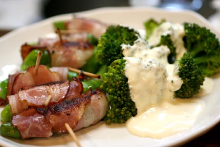 *しし唐のベーコン巻きとブロッコリーのチーズソース添え*