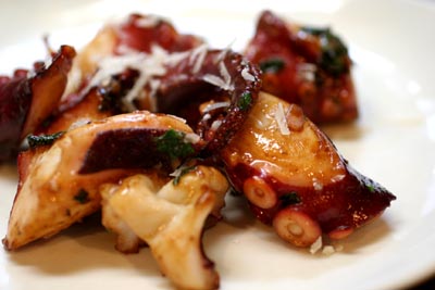 だんだんお腹がいっぱいになってきたけれどこれでは足りないとタコをオリーブオイルでにんにくと炒めて、ワインとチーズ・塩・コショウで味付けしたものもつまみでいただきました。