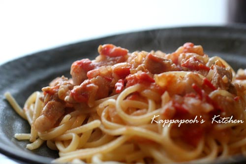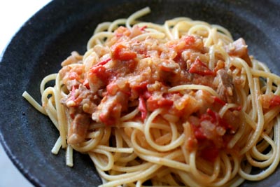玉ねぎのみじん切りをオリーブオイルで炒めて豚肉を加えてさらに炒めて白ワインを注ぎ、アルコール分を飛ばして、トマトのみじん切りを加えて煮込みます。生クリーム・ゴルゴンゾーラ(少量)を加えてよく混ぜ、途中パスタの茹で汁も足して塩・コショウで味を調えます。