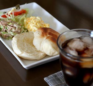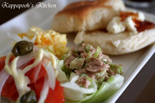 今朝は、夫がサンドイッチだったので、その残りの具でお昼はパンです。