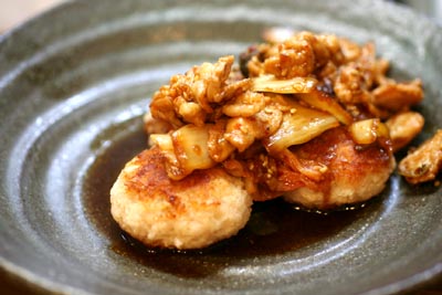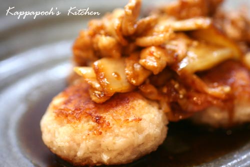 器にレンコン餅を盛って、豚キムチをのっける。