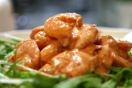 マヨネーズ・ケチャップ・豆板醤少々で作ったソースを絡めて。