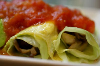 舞茸をアンチョビとともに炒めてレンジで加熱してしんなりしたキャベツで巻いて、玉子焼きで包んでトマトソースをかけました。