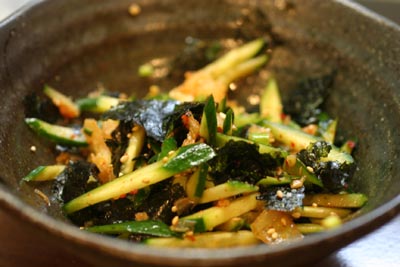ちょっとだけ残ったキムチときゅうりを合わせて残ったチヂミのタレで和え、韓国海苔を散らして簡単つまみです。