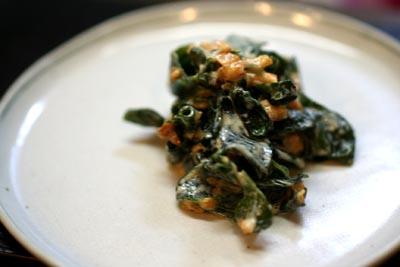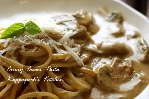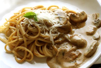 特に変わったことはしなくって、牛乳とチーズ(パルミジャーノ)を加えただけ。(生クリームは入れてません。)あ、それとキレイなマッシュルームを買ってきてあったので、それをスライスして加えました。一番最後に入れてあまり火を通しすぎないようにします。