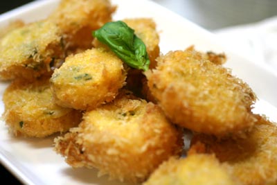フライの手順ですが、溶き卵にパルミジャーノチーズを摩り下ろして加え、バジルのみじん切りも加えたものを使って。
