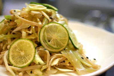 えのきとセロリを生姜のみじん切りと一緒にオリーブオイルで炒めて、醤油を少したらして、キャベツの千切りと混ぜ合わせてからしポン酢で合わせて。