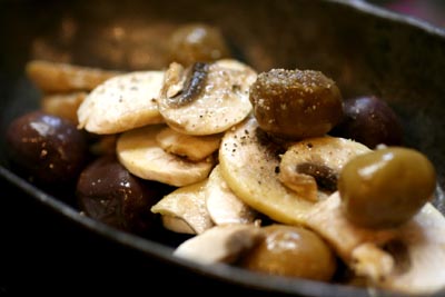 生のマッシュルームを切って、オリーブオイル、すだち、クレイジーソルトで和えてオリーブを添えました。