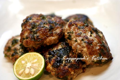 ひき肉に、戻して細かく切ったワカメ・水をしっかり切った豆腐・溶き卵・塩・コショウ・柚子の皮をすりおろしたものを加えてよく混ぜ、油をひいたフライパンで焼きました。