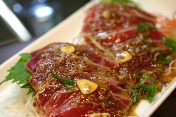 カツオの霜降りをマスタードソースで。これはささみさんのところで発見して、これやってみよう!と思ってやってみた一品です。